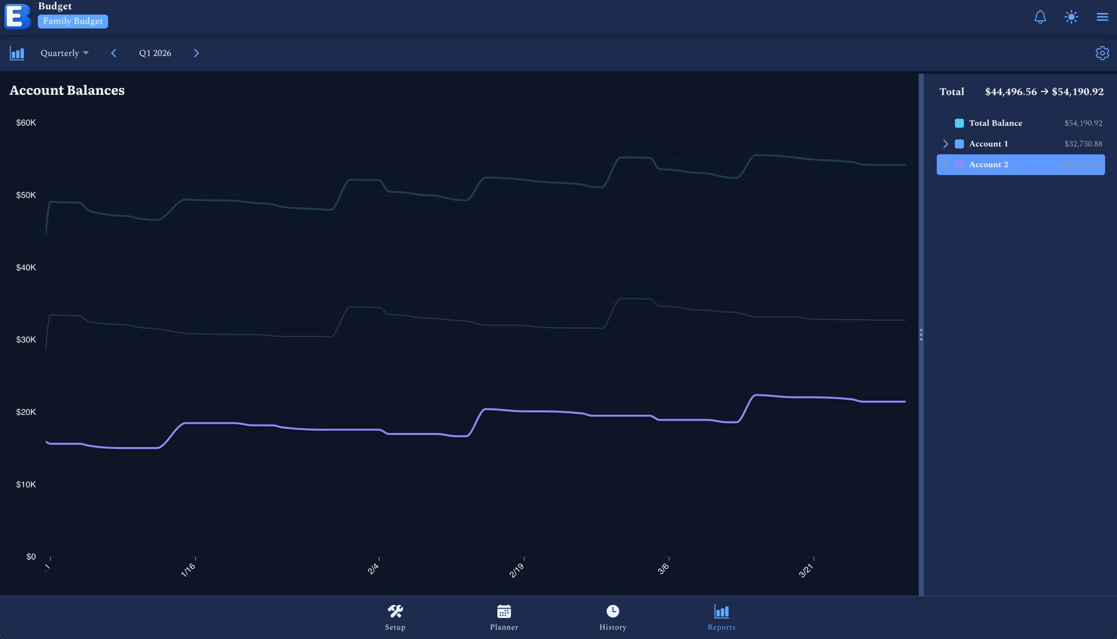 Toggle the Cash Flow chart to a bar view to analyze income versus expenses over flexible timeframes like Pay Period, Month, or Year. See whether your net flow is positive or negative and verify it matches your planner data exactly.